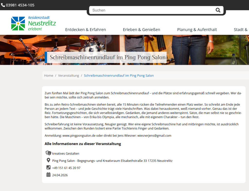 Am Freitag, den 24. April gibt es von 19 bis 22 Uhr, wieder einen Schreibmaschinen-Rundlauf im Ping Pong Salon in der Neustrelitzer Elisabethstraße 33. Ein kreativer Schreibabend, der sich explizit an alle und nicht nur an Schreibprofis richtet. Das Konzept ist einfach: Eine Handvoll oldschool mechanische Schreibmaschinen von Erika bis Olympia warten darauf, dass ihr in die Tasten haut. Ca. alle 10 Minuten wird die Maschine gewechselt, so schreiben alle zusammen an ganz unterschiedlichen Texten. Das meist sehr amüsante Ergebnis lesen wir uns zum Abschluss natürlich vor.
